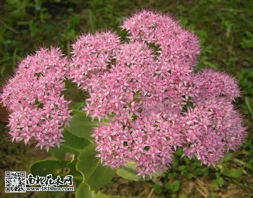 多年生肉質草本植物,株高30~50cm。地下莖肥厚,地上莖簇生,粗壯而直立,全株略被白粉,呈灰綠色。葉輪生或對生,倒卵形,肉質,具波狀齒。傘房花序密集如平頭狀,花序徑10~13cm,花淡粉紅色,常見栽培的尚有白色、紫紅色、玫紅色品種。 花期,7~10月。