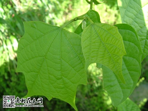 葉紙質,近圓形或橢圓形、卵形,頂端短銳尖或鈍尖,基部兩側常不對稱,一側微向下擴張,另一側向上傾斜,闊楔形、截形、稀近于心臟形,不分裂或3-7 (-9)裂,裂片短銳尖或鈍尖,葉上面深綠色,無毛,下面淡綠色,除脈腋有叢狀毛外,其余部分近無毛;基出脈3-5 (-7),成掌狀,側脈3-5對;葉柄長2.5-3.5厘米,紫綠色或淡黃色,幼時有微柔毛,后無毛。