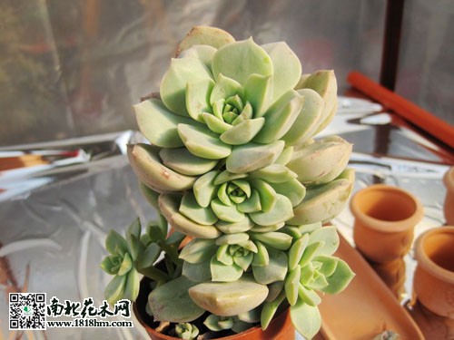 先是多肉的白牡丹,它的葉片是厚厚的,葉片的顏色是從綠色到灰白的,葉片上面是會有白霜的,要是放在陽光下曬那么它的葉尖就會慢慢的變成粉紅色,但顏色不會很濃,它生長是有規律的,一個長得好的白牡丹是有點像睡蓮那樣的,由于它的葉子上面又有白霜,會有點像牡丹一樣開放。多肉植物的白牡丹是會長花的,它的花一般是有五片花瓣,它的花瓣上面會有紅色的點點,它一般是在春天開花的。