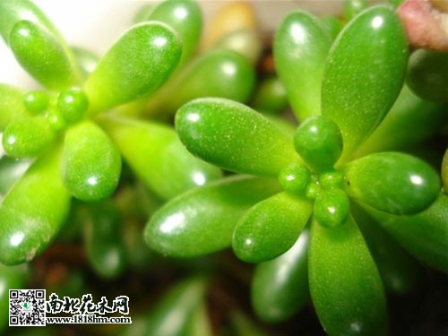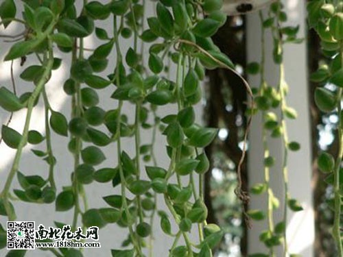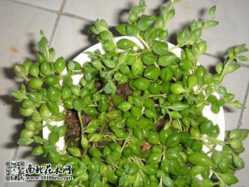 一粒粒圓潤的、肥厚的圓心形葉片,似一串串風鈴在風中搖曳,這就是它的葉子。因葉互生,生長較疏,圓心形,深綠色,肥厚多汁,似珠子,故有“佛串珠”、“佛珠"、”“綠葡萄”、“綠之鈴”之美稱。還有人稱它為“情人淚”。