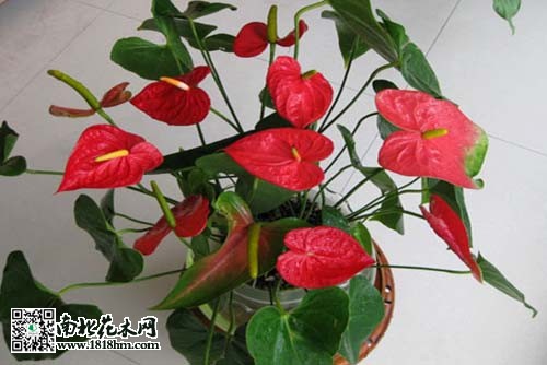 其花朵獨特,為佛焰苞,色澤鮮艷華麗,色彩豐富,是世界名貴花卉?;ㄆ陂L,切花水養可長達1個半月,切葉可作插花的配葉??勺髋柙?,盆栽單花期可長達4~6個月。周年可開花。