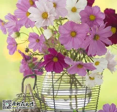 鏤空的鐵藝印襯出水中插滿的波斯菊,帶來一種透亮的歡快感覺。不妨試一試把玻璃花瓶放在一個略大一點的鐵藝籃之中,鐵藝藍寬大的開口剛好支撐起伸展出的花枝。