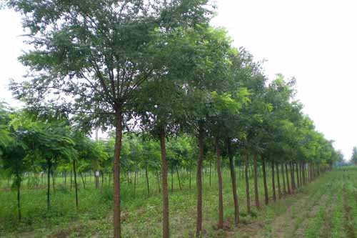 因種皮有細胞緊密結合的柵欄層,透水性差,播種前,用始溫85-90度的水浸種24小時,余硬粒再處理1-2次。種子吸水膨脹可播種。條播行距20-25厘米,覆土厚度1.5-2厘米,每畝播種量8-10公斤,7-10天幼苗出土,幼苗期合理密植,防止樹干彎曲,一般每米長留苗6-8株,一年生苗高達1米以上。也可早春集中營養缽育苗后移植定苗。國槐萌芽力較強,若培養大苗形成良好的干形,可在第二年早春截干,加大株行距,當年苗高3-4米,樹干通直,粗壯光滑。
