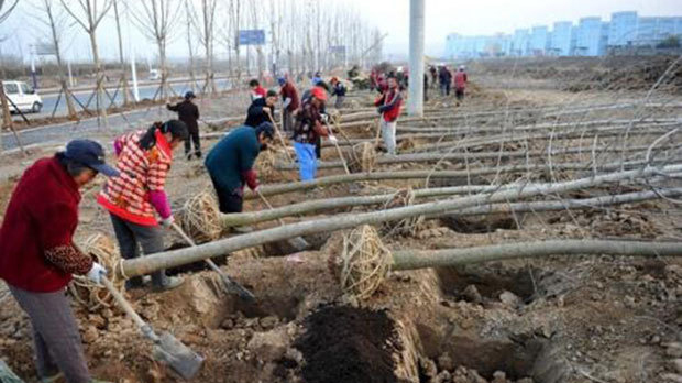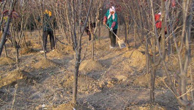 起樹是移栽過程中非常重要的一個環節,如果是大型樹木移栽一定要選擇專業隊伍,最好帶土球移栽,減少損傷。移栽前三天,要從樹下向樹上噴施抗蒸騰劑,土球應以不少于胸徑的十倍以上為佳,包裝時一般用草繩纏繞土球、樹冠等保護。