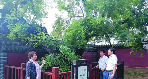 圖為曹恒星(左)在介紹鄒城市孟廟中的唐代古槐樹的保護情況。