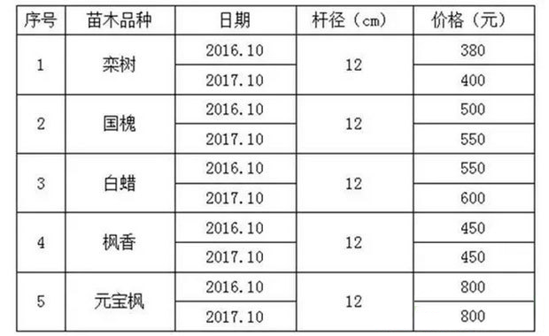 小編采集了五種常用鄉土樹種同一規格在2016年10月和2017年10月的報價對比,分析出各地鄉土樹種苗木價格均有所回升,即使沒有回升的也是平穩發展,沒有下跌。詳情見下表(數據來自苗木通大數據):