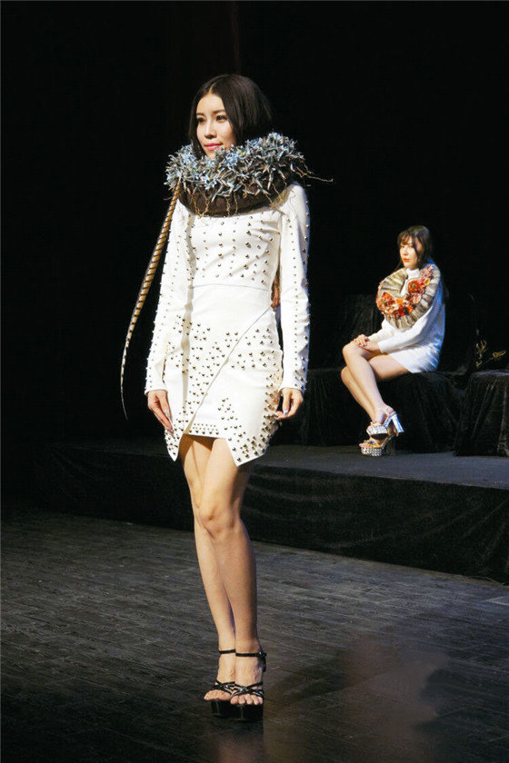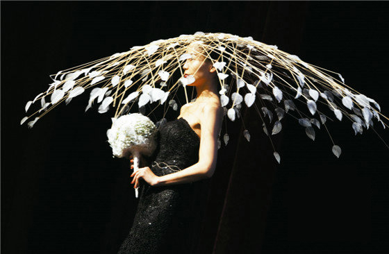 接下來出場的是周佩華,其設計一向有著珠寶花藝的獨特魅力。她擅于將金屬絲線手工塑形,此次她采用葉片造型粘貼葉脈紙張的工藝,將其涂金,黑色羽毛與金色葉片完美融合,作品彰顯內斂與奢華的設計內涵。身材高挑的模特緩步走向觀眾席,令珠寶花藝異彩紛呈?;顒咏咏猜晻r,周佩華將精心制作的3件施華洛世奇水晶配飾作為獎品,與現場觀眾互動,再次將花藝秀場推向高潮。
