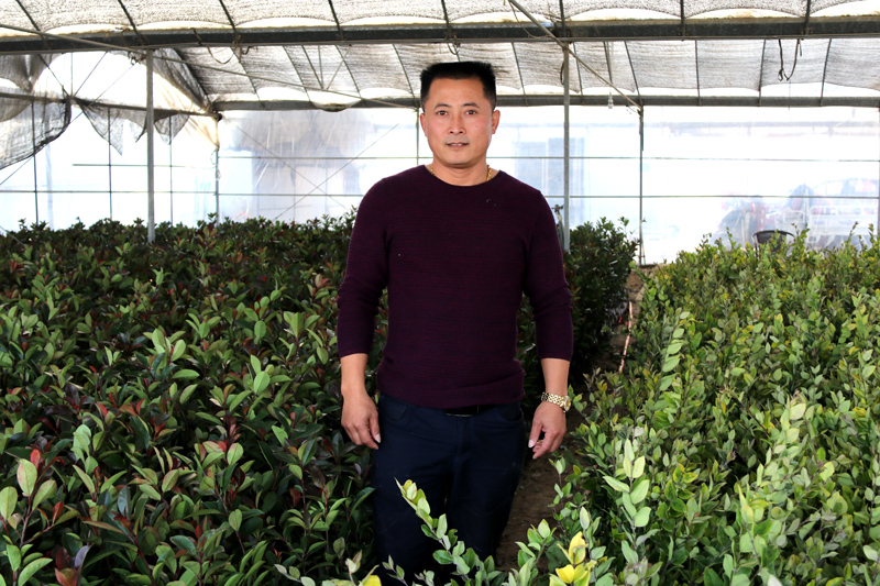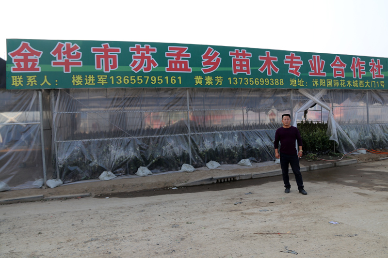 樓進軍為了銷售自己苗圃的苗木,從蕭山到夏溪、如皋,再到武漢,幾乎跑遍了全國的各大苗木市場,他的苗木生意也慢慢有了起色。2009年,樓進軍成立金華市蘇孟鄉苗木專業合作社,2013年進入沭陽國際花木城開展苗木生意,并創建了金華市成祥市政園林工程有限公司,如今他的生意越做越大,在沭陽國際花木城承租20多個攤位,主要經營紅葉石楠(球)、金森女貞、毛鵑、紅花檵木(球)、大小容器苗、茶梅、香樟、精品桂花、黃山欒樹,以及各種景觀色塊苗木。