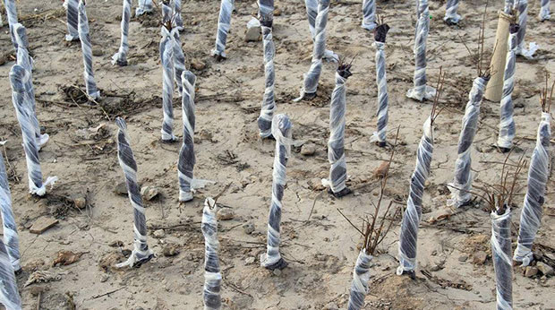 培土規格大小約為土堆直徑50-80厘米,高度30-50厘米,時間在冬灌完成之后。這樣不僅可以避免土壤水分的過多蒸發,也能保證苗木根頸以及樹根部位不至于由于低溫而凍傷。