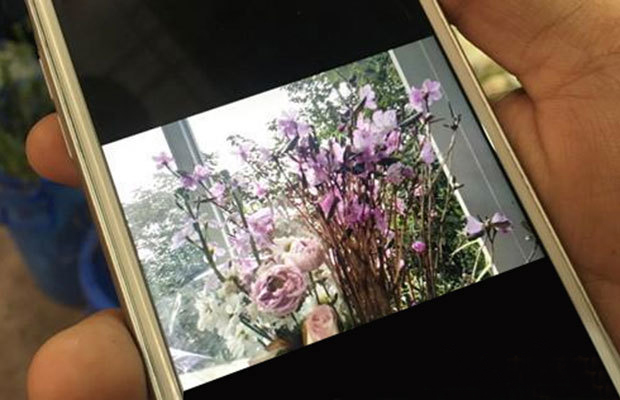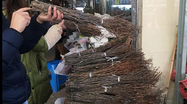 批發區門口一個商戶的貨架上,擺放了一堆形似枯槁的褐色“樹枝”,被捆成直徑約10厘米的一束,長近半米。走近看后,才能發現一個一個的花骨朵,“這個20塊錢一把,插進水里,過個六七天就能開花。”她拿出手機展示開花后的樣子:“像桃花一樣。”她并不清楚這花的具體名字,只知道是一種杜鵑,“本地不產,產地在東北。”接著,她又補充:“這是野生的,更鮮活一些。”