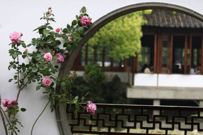 錦蘇閣周邊,鋪裝、墻體、月洞門和假山石上布置了藤本月季、球形月季和擺花,形成了熱情洋溢、風華正茂的濃厚氛圍,一定不要錯過。