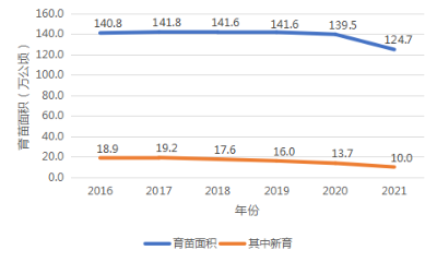 由于西北地區的氣候較為惡劣、地形較為復雜多變,該地區總體生態環境易受到影響,且該地區的森林資源較為匱乏,林木資源的地區性分布差異較大。作為我國重要的生態屏障之一,西北地區的林草資源發揮著涵養水源、保持水土、防風固沙、防災減災以及保護生物多樣性等多種生態功能。相比2020年,2021年西北地區的苗木新育面積和苗木產量減少較大,可供造林用苗量有一定減少,苗木實際使用量也有所下降,總體過剩趨勢有所緩解。2016-2021年該地區育苗面積及苗木供需趨勢如下: