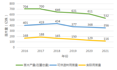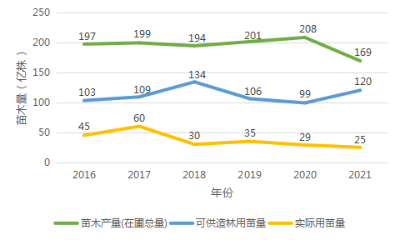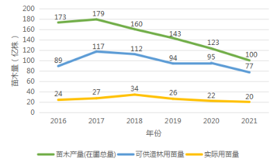 “十四五”規劃實施以來,全國苗木生產供應基本充足,但因受到新冠疫情和耕地保護等相關政策的影響,全國育苗面積自2020年開始下降,2021年降至125萬公頃左右。全國年可出圃苗木(可供造林用苗量)自2018年起呈現下降趨勢,2021年降至356億株左右;實際使用量亦呈現穩步下降態勢,2021年降至116億株,苗木總量過剩但結構性供給不足現象仍然存在。2016-2021年全國育苗面積及苗木供需趨勢如下: