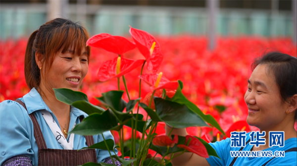 商河縣國家農業科技園區智能溫室大棚里的紅掌。新華網發