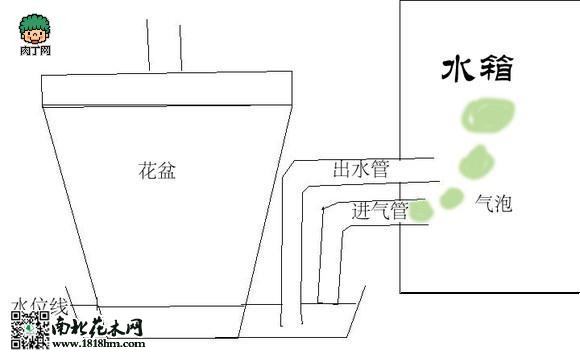 這是我們實現自動澆花的原理圖,利用虹吸原理讓兩邊的水壓把罐子里的水灌注到花盆下的碟子中,干燥的泥土會自動從碟子里補充揮發掉的水分,從而讓花盆里保持植物生存所需的濕潤環境。
